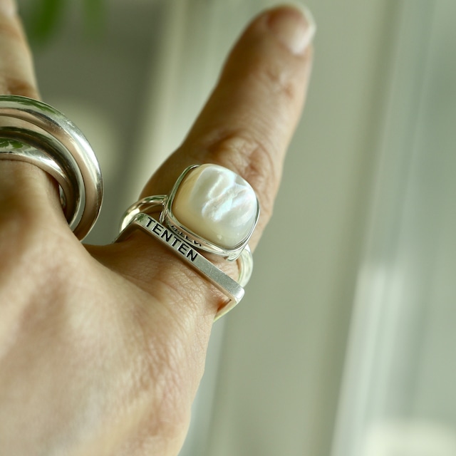 マザーオブパール 真珠の母。 真珠層のこと。 貝の内側に作られる層で 内側に入り込もうとする異物から保護する働きをします。 その表情は虹のようなオーロラのような どこか愛らしさのある美しさ。 ぽってりとした乳白色も魅力です。 silver925との組み合わせで モダンな存在感のringに。 コーデ次第で表情が変わるのも楽しい。 素材 マザーオブパール 12×12×6mm size 15号(±3号目で調整可能)