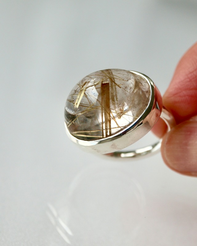 夢のままでは終わらせたくない目標への情熱を呼び覚ます、 集中力を高める、精神力UPの最高峰「ルチルクォーツ」針水晶の人気は誰もが知るところ。 そういう話を度外視しても 金線ルチルがカボションの中に広がる小世界には思わずうっとり♡ ひとつひとつ石が異なり、いいな!と思うパワーある石に出会える機会は本当に少ないのです。 この美しさ、絵画的要素を最大限に生かせるようデザインしました。 ゴールドルチルは[ヴィーナスの髪の毛]に例えられます。 ふわっと柔らかい金線を閉じ込めたringです。 素材 gold rutile quartz(ブラジル) 23×18.5×14.5mm 42ct silver925 size 17号(±3号までsize調整可能) Gold rutile is often likened to the hair of Venus. This ring features soft, fluffy gold wire. Material: Gold rutile quartz (Brazil), 23 x 18.5 x 14.5 mm, 42 ct, Sterling Silver 925 Size: #17(jp) 8.2(US) (adjustable up to +/- 3 sizes)