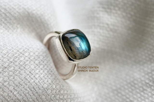 手元にアゲハ蝶が舞い降りた‥‥ ラブラドライトの中でも虹色のものは大変評価が高く 別名「アゲハ蝶」と称されます。 こちらは愛らしさのあるクッションカボが魅力。 さりげなくアゲハのシラーを見せるringです。 装いをグッと引き締まった印象に導きます。 素材 labradorite 12.5×12.5×7mm silver925 size 14号(±3号までsize調整可能)